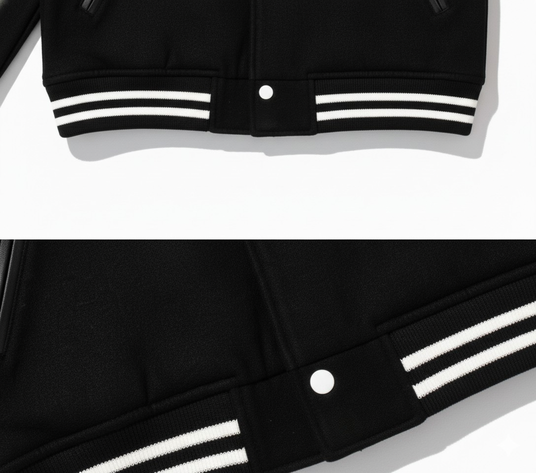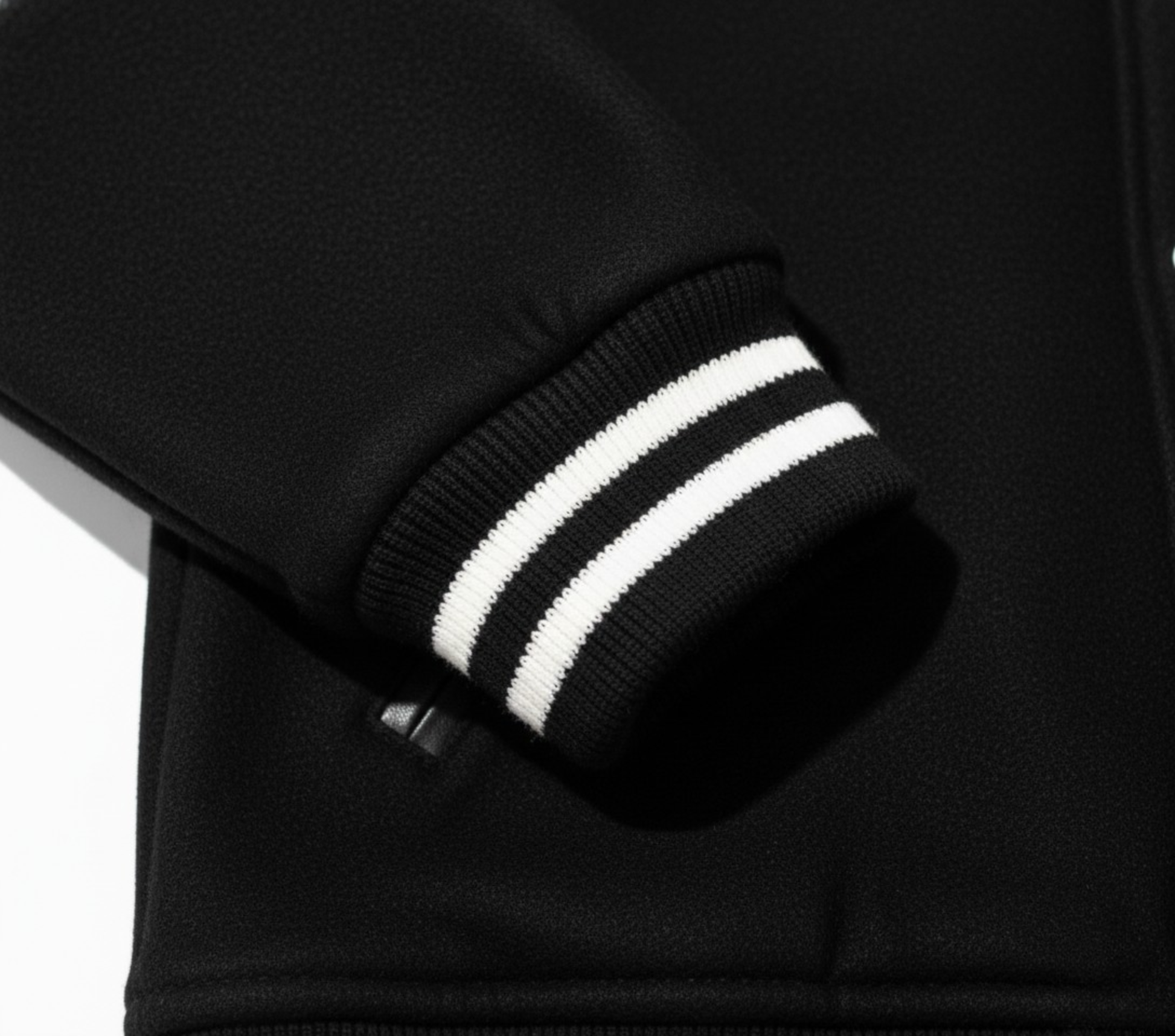 مع تفاصيل مخططة باللونين الأبيض والأسود على الياخة ومعصم اليد والحافة السفلية،